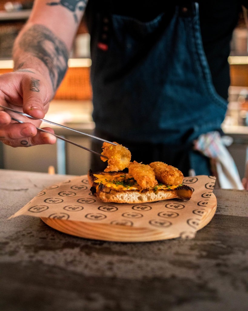 Para inaugurar la temporada estival, han incorporado varias novedades en su apetecible carta. En primer lugar, el maravilloso bocadillo de cigala con mayonesa de ajo y kimchi. Un bocata que elaboran con un crujiente y delicioso pan de cristal, relleno de cigalas fritas en un panko especiado, que le proporciona un acertado toque picantito, que nos conquista desde el primer bocado. Además, su interior alberga también una refrescante ensalada de rúcula, tomate y cebolla roja, aderezada con una cremosa mayonesa de ajo asado y kimchi, que le otorga a esta receta un fabuloso sabor. Una receta que podría calificarse como la «galleguización» del lobster roll americano que se ha puesto tan de moda últimamente, y que en Arallo Taberna adquiere una nueva dimensión. Una suculenta propuesta que, curiosamente, tuvo su origen en una clásica marisquería de La Coruña y no en Estados Unidos, como se suele pensar.