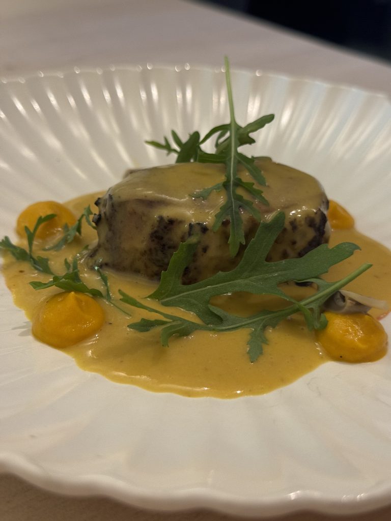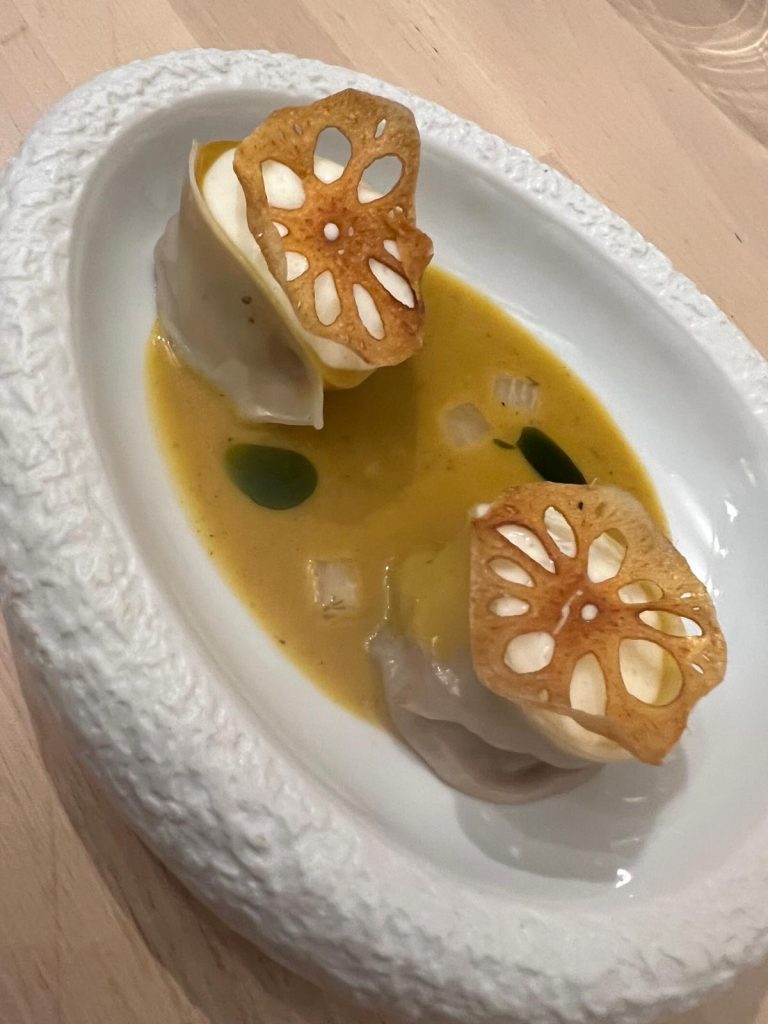 Después, con unos irresistibles dumplings rellenos de ternera de Guadarrama con curry japonés, raíz de loto frita, nabo encurtido y espuma de coco.