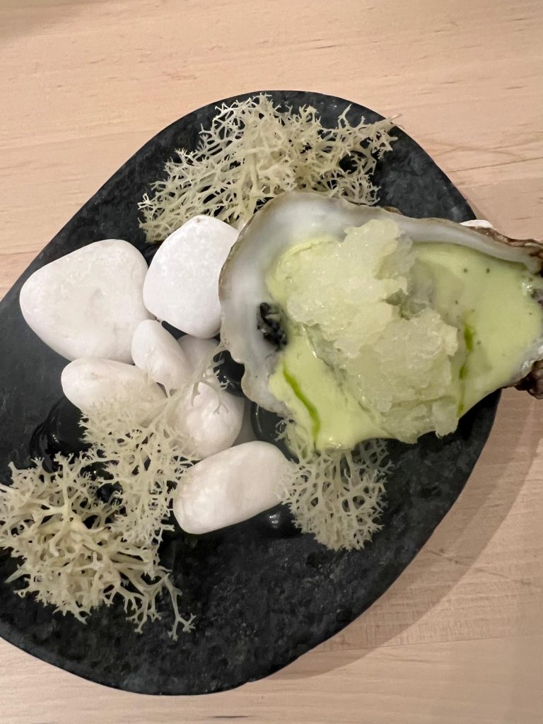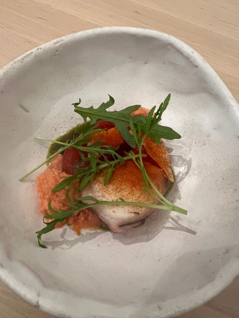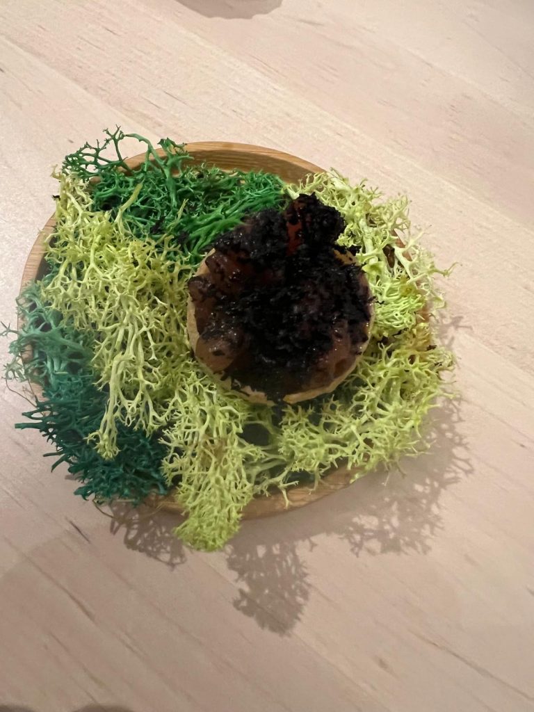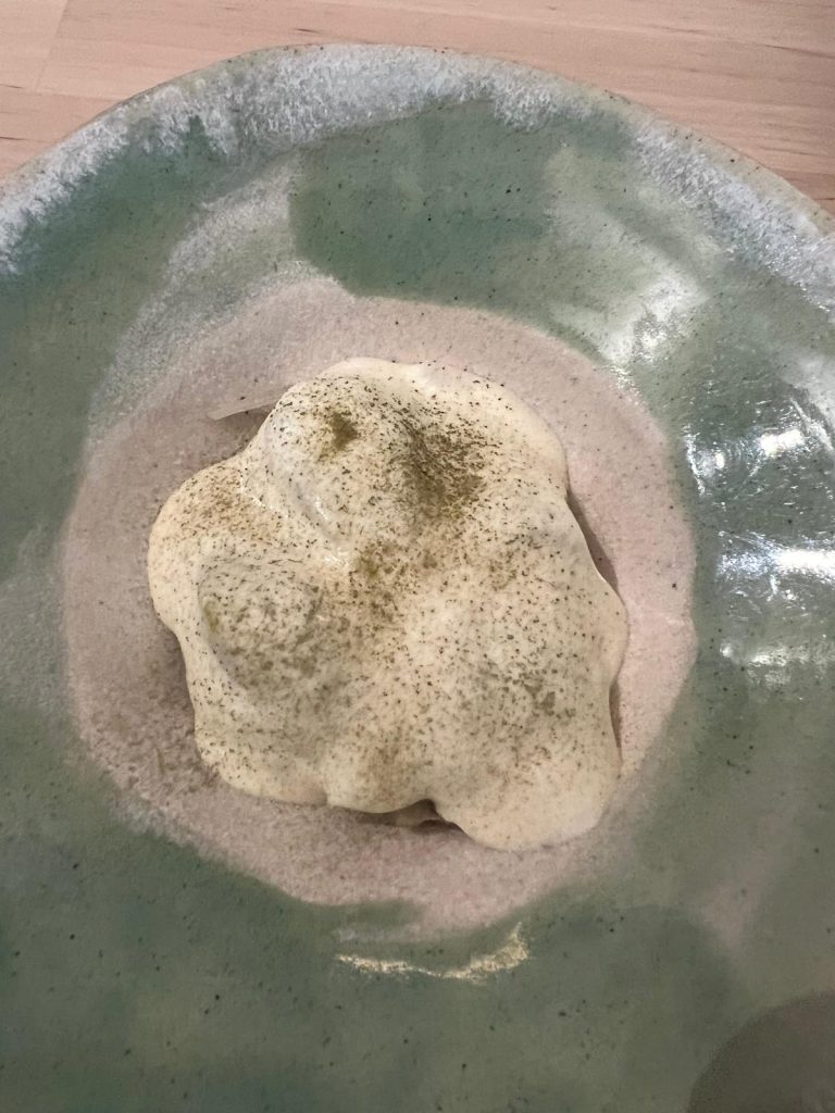 Ligera, original y deliciosa, desembocó en un exquisito puerro que preparan primero a baja temperatura y luego brasa, y que va acompañado de una espuma de mantequilla tostada y miso.