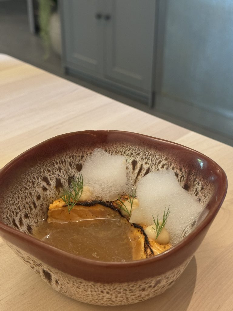 Una delicia en toda regla que nos llevó directos a un correcto salmón marinado en mojo canario japonés con sake y miso rojo con aire de apio y caldo dashi