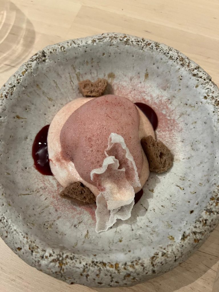 Con una curiosa cereza en texturas que elabora con espuma, aire, bizcocho y gel de cereza roja, que van sobre una base de helado de cereza negra, y que por último coronan con cereza liofilizada y papel de arroz.