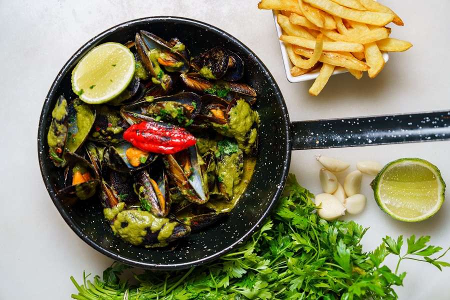 Los mejillones son el alma de la carta, presentes en una decena de recetas diferentes, desde los clásicos al vapor hasta versiones más atrevidas con curry o también el cheviche, especialidad de su chef peruano, reflejo de la creatividad y la pasión de sus fundadores.