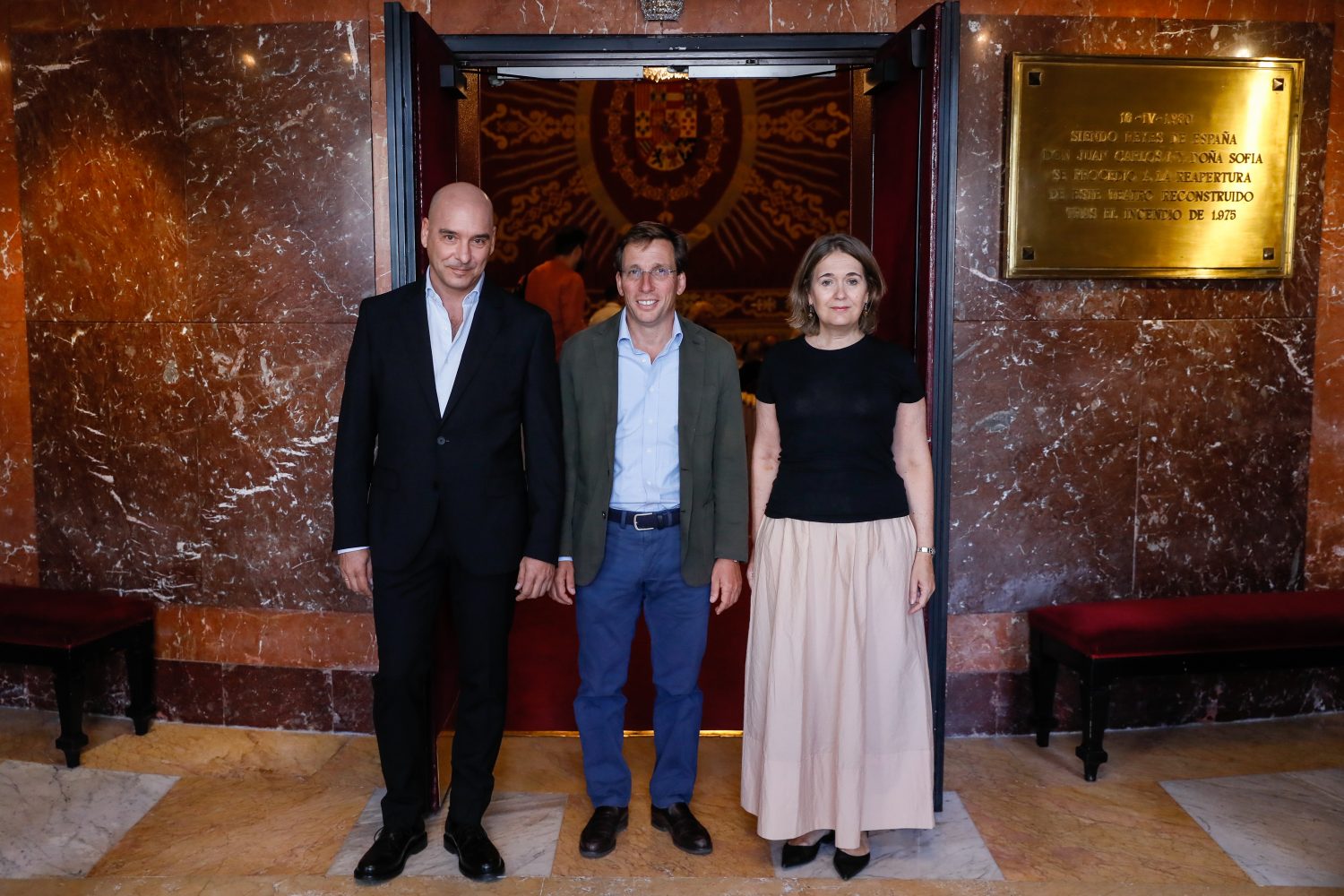 El alcalde de Madrid, José Luis Martínez Almeida y la delegada de Cultura, Turismo y Deporte, Marta Rivera de la Cruz. junto al nuevo director del Teatro Español, Eduardo Vasco, han participado en la presentación de la programación 2024-25 del Teatro Español que arrancará el 10 de septiembre,