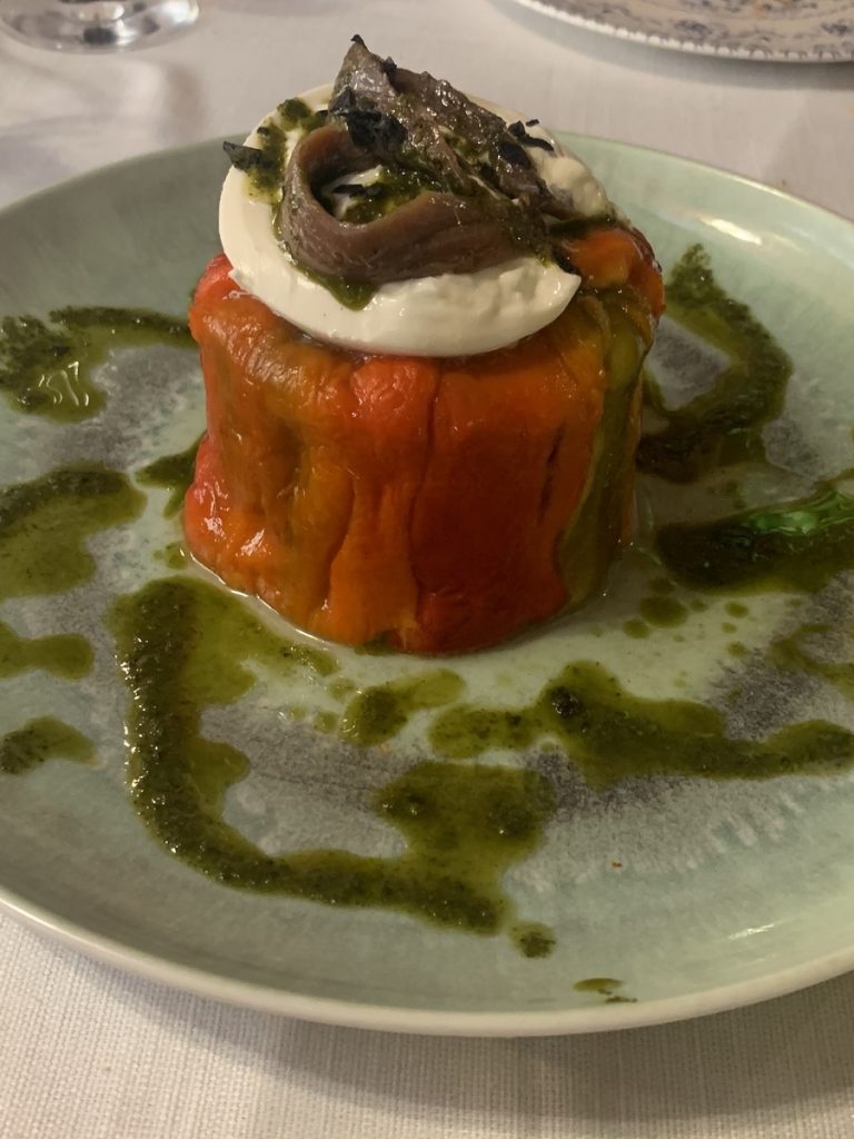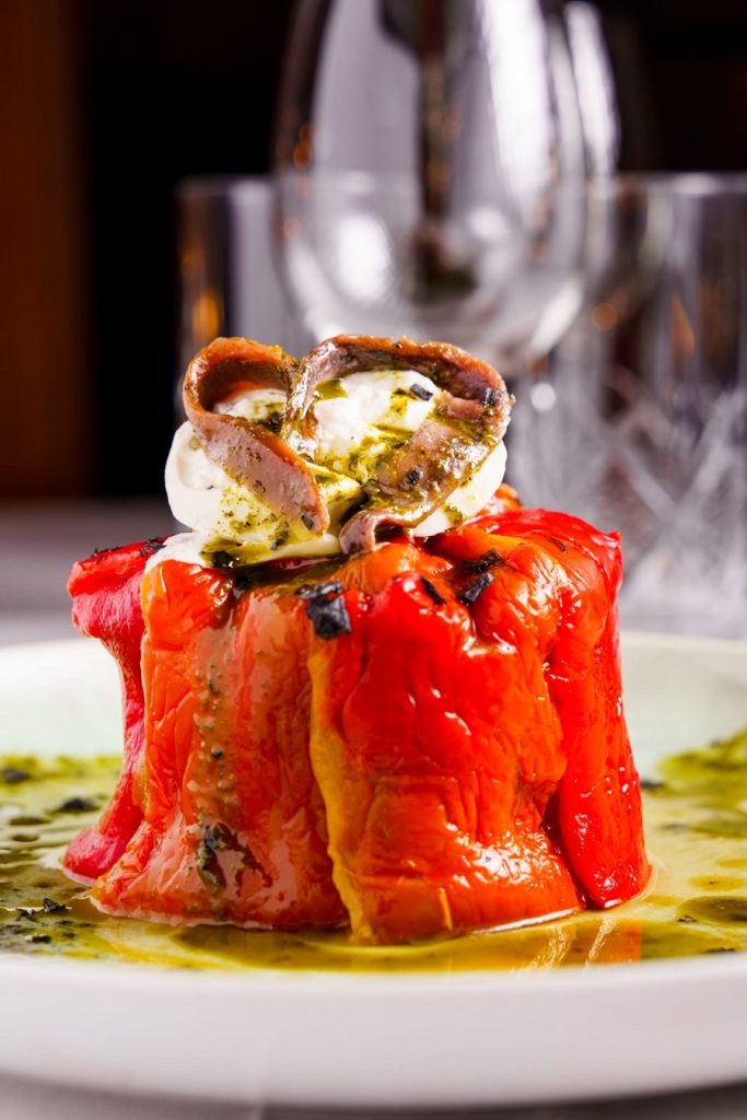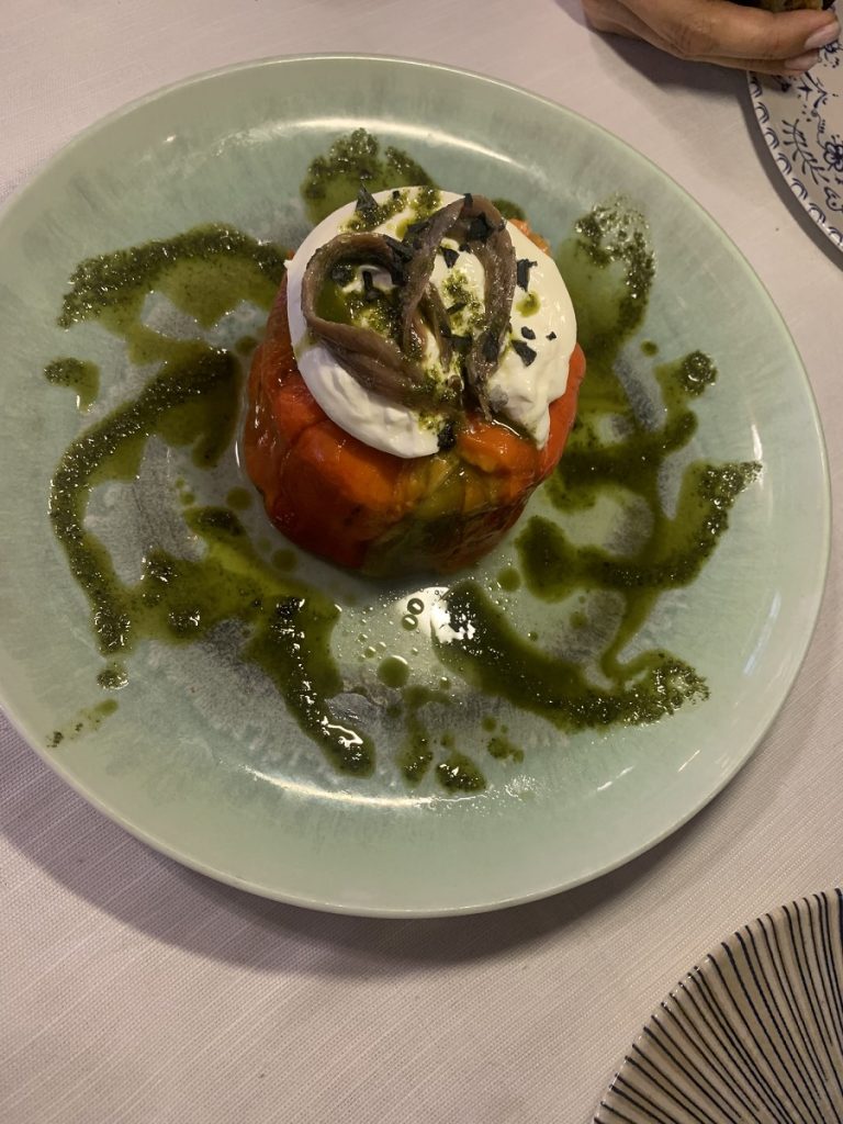 Tartar de tomate con pimientos asados, burrata y anchoas en forma de corazón