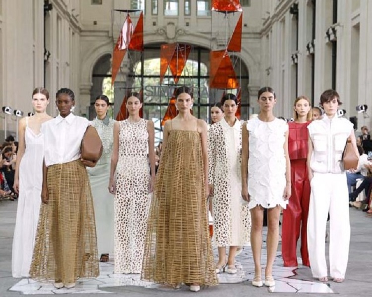 Los patrones fractales no solo aparecen en bordados y estampados, sino también en los cortes y en la manera en que los tejidos se despliegan, multiplicándose en estructuras que fluyen con naturalidad.
