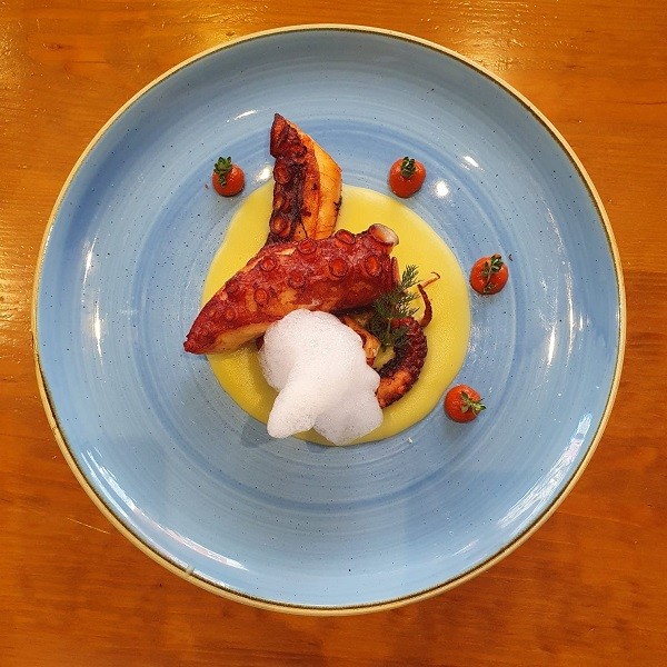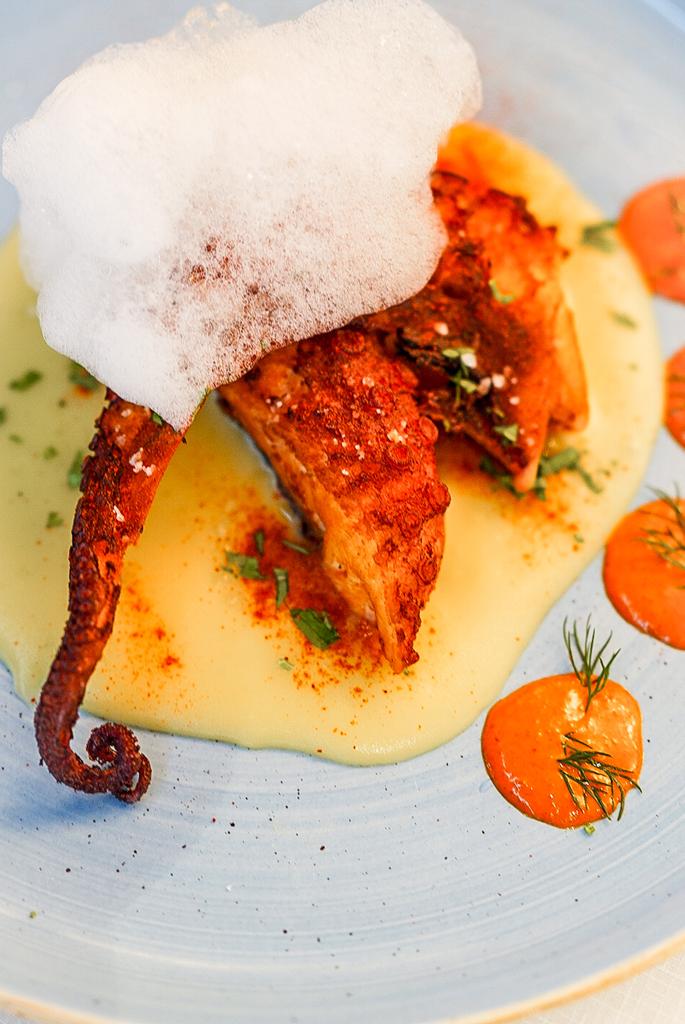 La propuesta de este pulpo a la brasa, se acompaña de muselina de patata, mojo picón y aire de Albariño. ¡Irresistible!