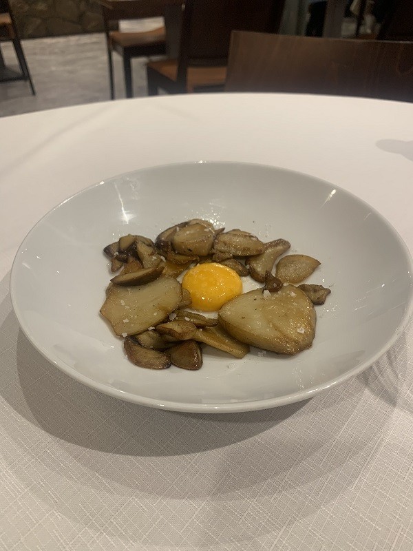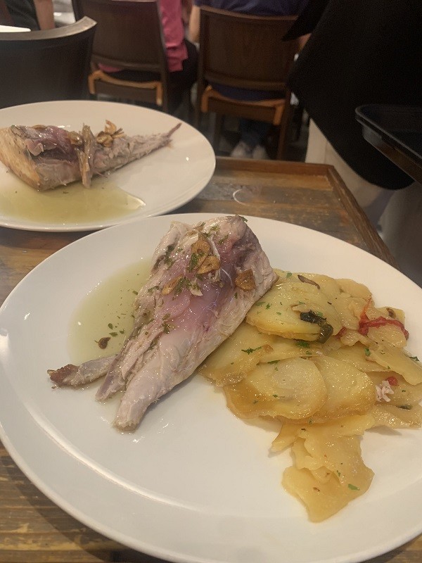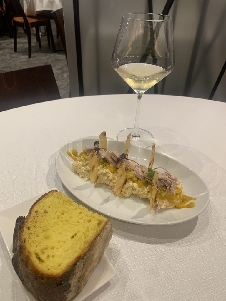 En nuestra visita comenzamos con una ensaladilla rusa, con atún casero con la salsa elaborada en su propia emulsión, el pan sardo, también de elaboración propia, nos aporta la superficie para disfrutar aún más de su sabor. Maridamos con vino alvariño Floklore.