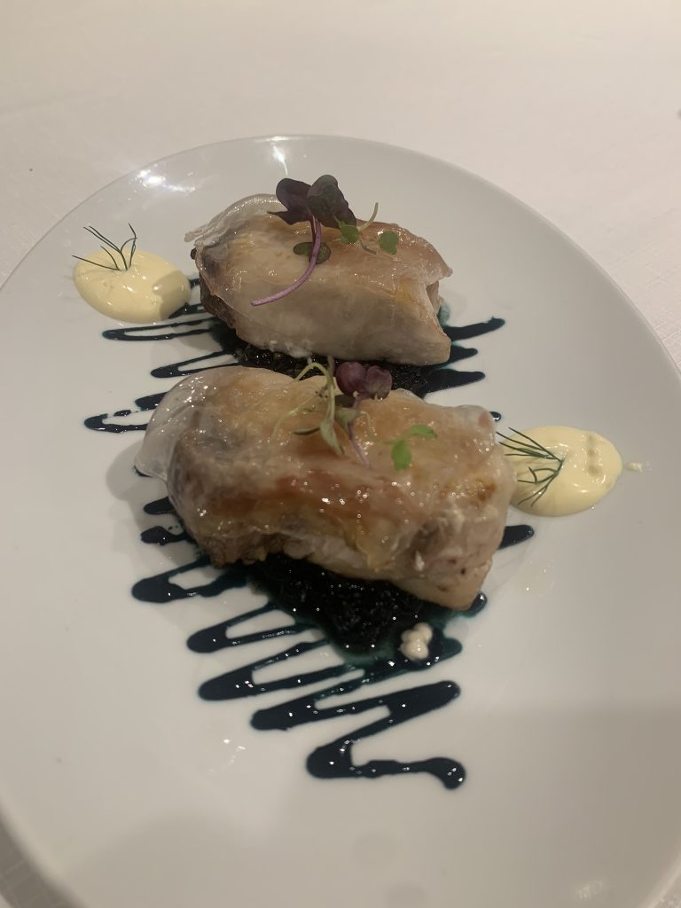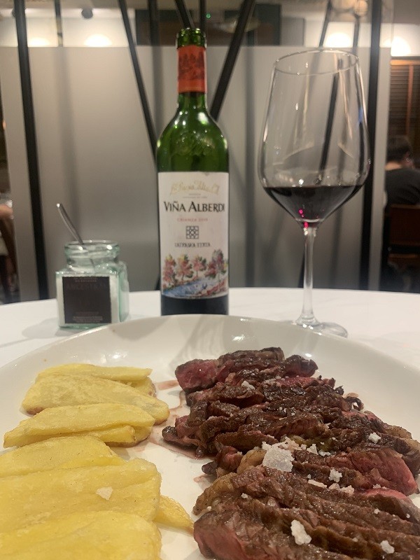 La corbina con una base de chipirón y salsa de alioli y un toque de lima, se suma a nuestra mesa y le sigue un delicioso lomo alto argentino, ambos a parrilla de encina. Los segundos dieron paso a las delicias del tinto de rioja alta Viña Alberdi, crianza 2019.